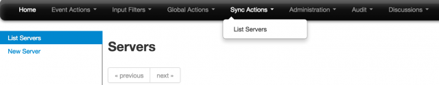 On the server that is “hosting” the events you now have to add the server to which you will push the data. The sync servers are listed under Sync actions, List servers.