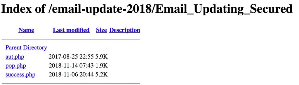 This also gives away that the campaign was most likely launched (or at least the scripts were installed) on 14 November 2018, the day that I received the phishing mail. Would it be possible to move up one additional level? Yes. And this time we’re even more lucky as there’s a zip-file for downloading.