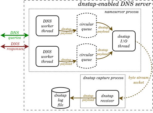 An alternative to DNS query logging is dnstap. Dnstap is a flexible, structured binary log format for DNS software that uses Protocol Buffers to encode events in an implementation-neutral format. Dnstap exists for most open source DNS servers as Bind, Knot and Unbound. The major advantage of Dnstap is demonstrated via its architecture schema.