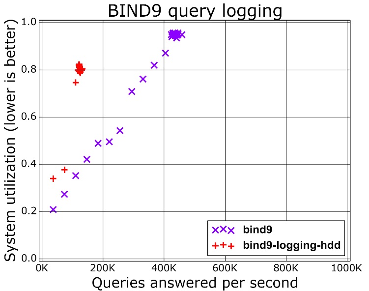 But DNS logging comes at a price. Every log operation requires the system to write out an entry to disk (besides also properly formatting the log string). This is a slow I/O-operation and limits the maximum amount of queries that your system can answer. A graph (slide 13) from a presentation from Farsight Security shows the difference of running BIND9 with or without query logging.
